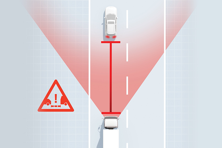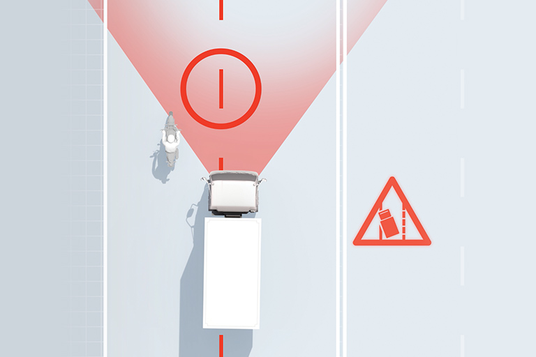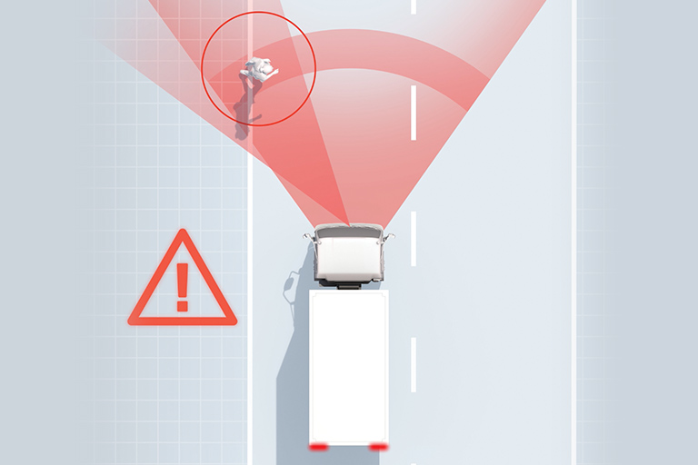 FCW scans the road ahead to detect vehicles, pedestrians, bicycles, or other obstacles. Using a stereo camera system enables the truck to judge distance and relative speed in a similar way to human eyesight. If it senses a potential collision, it provides visual and audible warning to the driver.